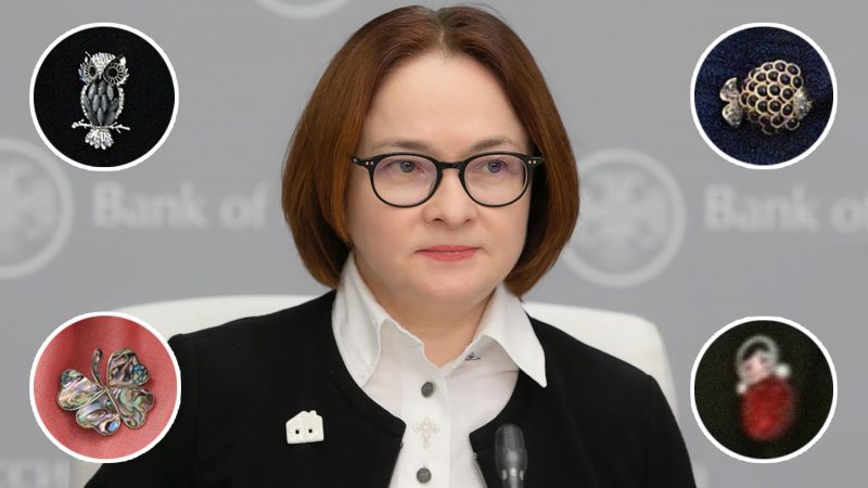 До признания Нибуллиной журналисты подозревали, что у брошек главы ЦБ есть особый смысл. Особенно выделились несколько украшений. В марте, глава ЦБ выбрала неваляшку, в апреле брошь была в форме домика, а в июне — голубя.